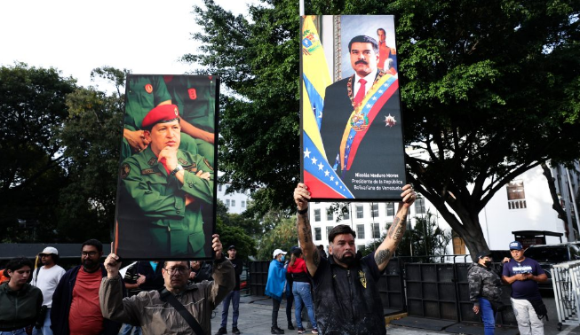 Supporters of Nicolas Maduro and late Hugo Chavez hold posters with their images