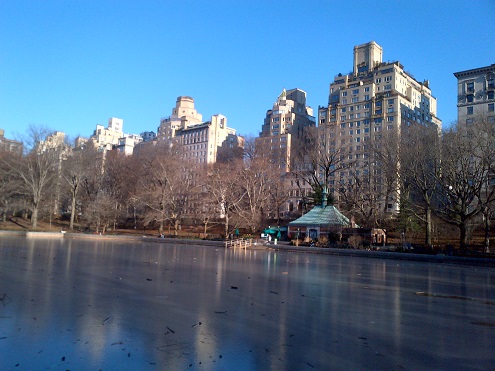 Лёгкий снежок. Накануне был снегопад, снегоочистительные машины ещё не прошли, льда и того, что сверху, не видно. Чувствуем себя героями. Скоро разочаровываемся. Нас обгоняет очень экстравагантный сухопарый джентельмен, без шапки, с длинными седыми волосами. Увидели много морщин в промелькнувшем, почти коричневом, профиле. Вот едет очень ярко одетая толстая дама, держась за специальное, скользящее по льду устройство из толстой изогнутой арматуры. Молодая пара, катящая перед собой крытую карету (иначе не скажешь) с ребёночком внутри, может, и с двумя. Очень быстро и уверенно передвигающаяся пара молодых парамедиков с красными крестами на рукавах и небольшими рюкзаками. О! Вот это - да! Держащаяся за руки изысканно экипированная пара в ещё более элегантном возрасте, чем мы. Они нам улыбнулись ослепительными американскими улыбками и помахали ручками. "Hi! What a nice day!" - и заскользили мимо, оставив нас с открытыми ртами.