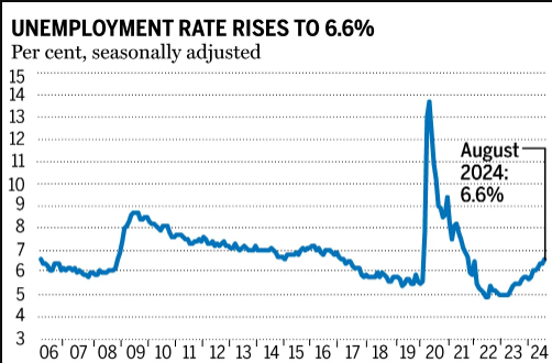 В августе безработица в Канаде достигла 6.6% — это наивысший уровень с середины 2017 года, если не учитывать пандемию COVID-19. Хотя численность рабочей силы выросла на 83,000 человек, страна потеряла почти 44,000 рабочих мест на полный рабочий день за тот же период.