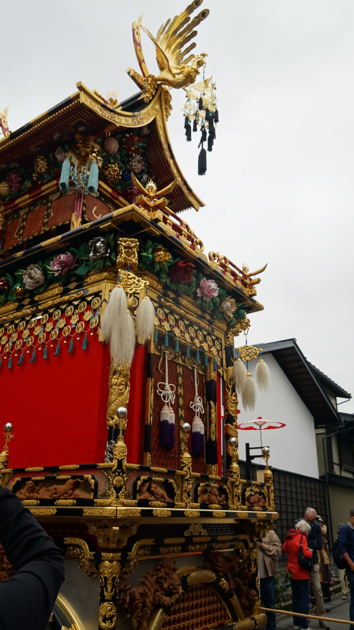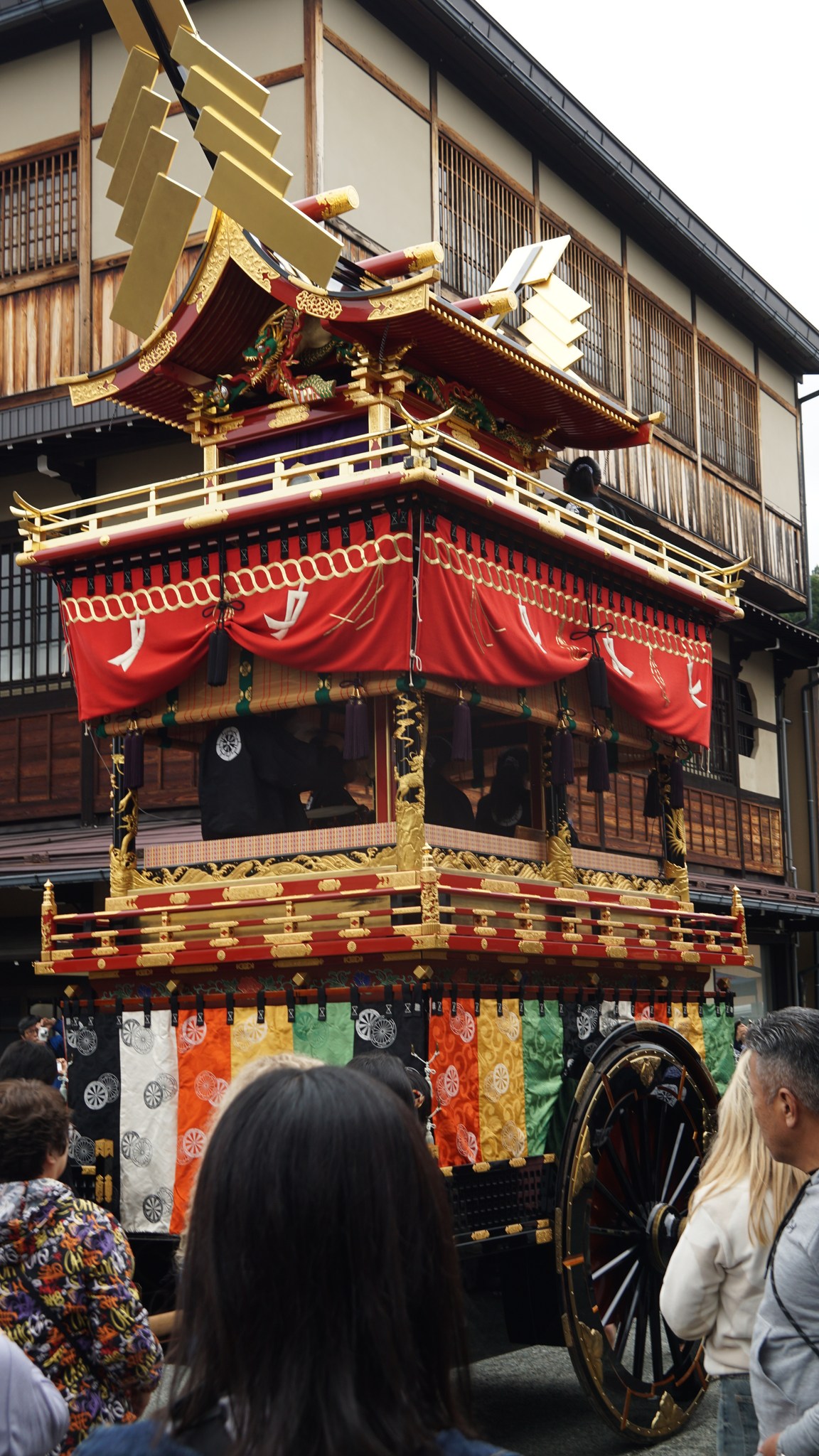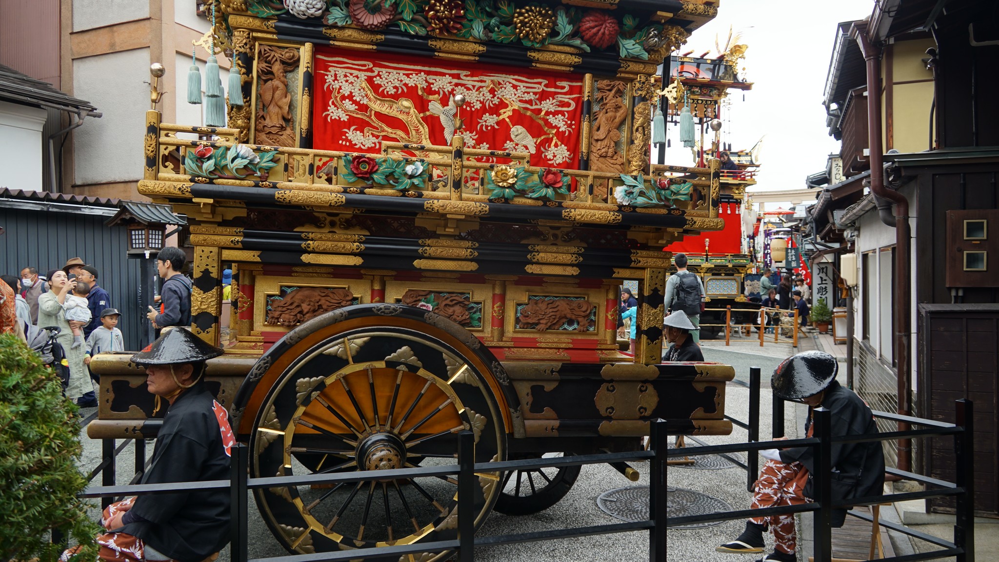 We felt like we were touching living history – centuries-old parade floats majestically floated through the streets against the backdrop of vibrant autumn foliage. Even though the floats are three or four stories high and have musicians inside, they are pulled by people, not horses. When turning curves, they have to be turned by lifting one pair of wheels with a hand jack. But this tradition has been preserved since the 16th century, and the Japanese hold tradition in high regard. The floats are carefully restored, but these are the same 12 floats that residents pulled through the city many centuries ago. The Takayama Festival is listed as a UNESCO Intangible Cultural Heritage site, and it's no surprise. Each float, or yatai, is meticulously decorated, and some are even equipped with karakuri ningyo—mechanical dolls that dance and perform tricks. We were thrilled to see two small dolls flip in mid-air and land on the shoulders of Hotei, the god of good fortune. The dolls were stunning and had facial expressions. Each doll is controlled by five or six people hidden inside the float. The dolls aren't suspended by strings and can move and perform somersaults, making the puppeteers' job very difficult and risky. Spectators watched the dolls' somersaults with bated breath, and when one of the dolls accidentally fell, it caused a real storm of emotion among the huge crowd!