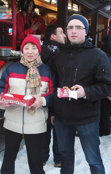 После выпитого мы "немного под шафе". Наконец прибываем к пункту Б. Встреча у ресторана Ritz. Так же, как и на исходном пункте А (ресторан Mexicano), довольно большая площадка занята многочисленными торговыми павильонами, лавками, столиками, туалетами и портативными газовыми каминами. Наш внук Денис, здоровый, тьфу-тьфу, парень, уже доедает за столиком своё излюбленное лакомство - beaver tail, в переводе "хвост бобра" - большой, длинный, очень горячий пирожок со сладкой начинкой, во время еды текущей по подбородку и рукам. Мы тоже покупаем себе и едим, облизываясь и запивая горячим какао. Есть огромный брезентовый павильон. Внутри стоят лавки и довольно тепло. Воздух согревается дыханием множества находящихся там людей и испарениями горячих напитков. Смех, красные лица. "Подопечный" народ собирается ехать ещё дальше, у них много сил и ещё есть время. Учительницы нигде не видно. У неё своя жизнь, встреча у пункта А в час дня.